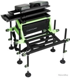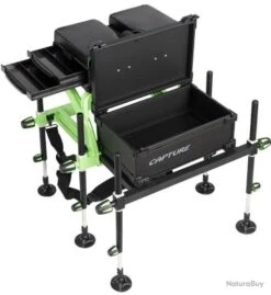 Capture Outdoor, station de pêche « Prestige XP-6 Competition ». La station est composée de 6 pieds télescopiques de diamètre 25. Les pieds à rotule sont extra-larges. L’assisse est dotée d’un bloque-talon. La station propose une plateforme repose-pied de 48,7 x 35,2 cm. Le bloc supérieur sous l’assisse est composé de 2 tiroirs latéraux compartimentés en 4 (43 x 25,5 x 2,2cm chacun) et d’un troisième compartiment (43 x 25,5 x 2,7cm). La station offre également un caisson de rangement amovible avec poignet de transport (43,5 x 27 x 15cm de profondeur). Cadre en aluminium. Système de serrage anti-rayure. Assisse et sangle-épaule rembourrée. La station totalement repliée mesure 48 cm de hauteur, 69,5 cm au plus large et 45 cm de profondeur. Son poids est de 17,2kg.