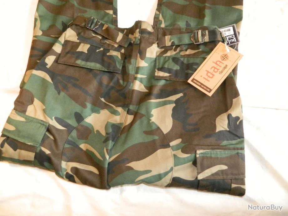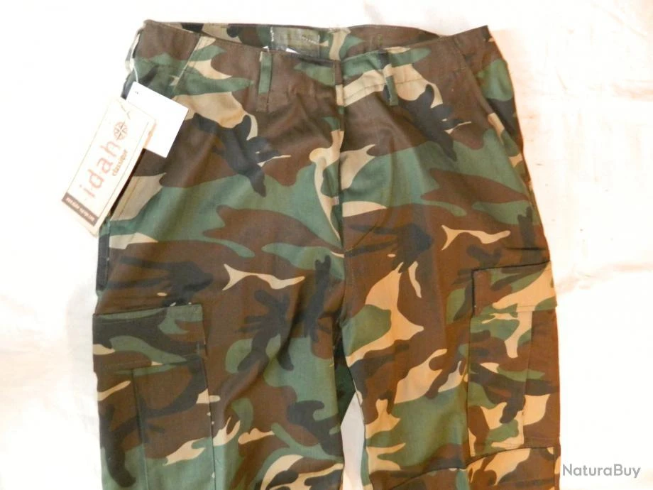 Pantalon de marque MFH 100% coton Ripstop, camouflage digital. poches mains, 2 poches cargo avec cordon de serrage, 2 poches arriÚres à rabats et 2 poches à rabats au niveau des mollets. Renforts aux fesses, emplacements aux genoux fermés par velcro pour mettre des renforts en mousse, cordons de serrage à la taille et en bas des jambes.