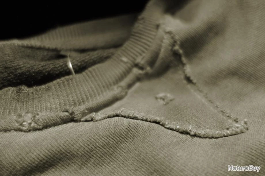 Les points forts sont les patchs aux coudes avec une dispersion de trous grignotĂ©s, les patchs avant avec des bordures effilochĂ©es, les dĂ©tails dĂ©chirĂ©s et coupĂ©s qui donnent Ă la piĂšce un aspect plus historique simulant l’usure naturelle et l’effilochage.