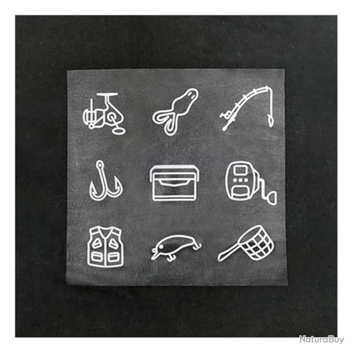 Ce modèle comporte 9 symboles d’accessoires de pêche, tels qu’un leurre artificiel, un moulinet à tambour, un moulinet électrique, un hameçon, etc.